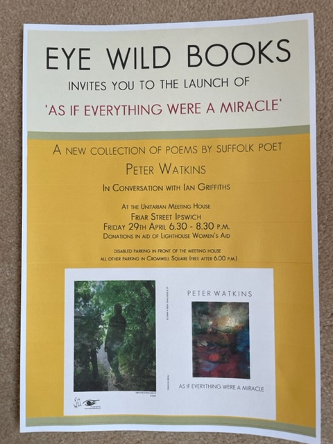 Invitation to a book launch Posted byiumhfriends2021April 11, 2022Posted inUncategorized As if Everything were a Miracle – a collection of poems by Peter Watkins Share this: Click to share on X (Opens in new window) X Click to share on Facebook (Opens in new window) Facebook Like Loading... Related
