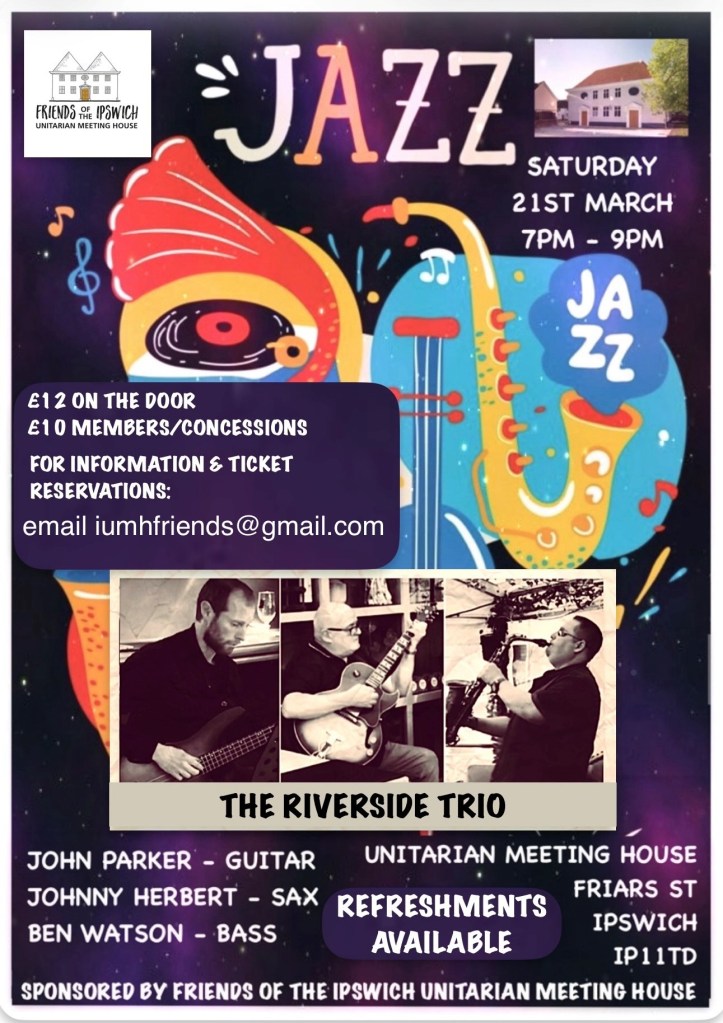 Thursday 25th January 2024, 7pm AGM of the Friends of Ipswich Unitarian Meeting House . The formal business of the meeting will be followed by a short organ recital by Meeting House organist, Robert Waller, which will offer a taster for the celebration in March of Robert’s 50 years as the Meeting House organist.